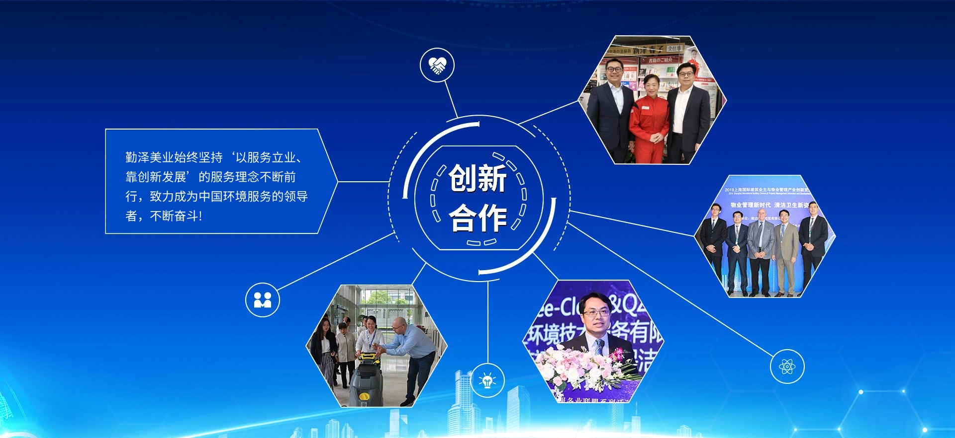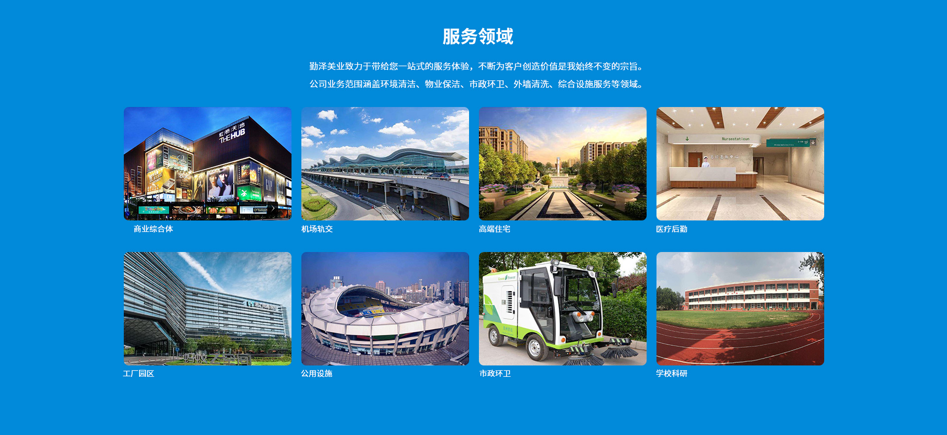 公司致力于把“勤澤美業(yè)”培育成眾口皆碑、令人尊敬、具有長期價值的服務領袖品牌。業(yè)務范圍涵蓋環(huán)境清潔和綜合設施管理服務,公司具備環(huán)衛(wèi)、保潔、石材等多個行業(yè)一級資質,致力成為中國環(huán)境服務行業(yè)的領導者。